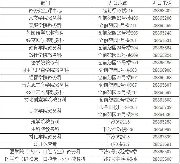 11.因各种特殊情况没选上课的同学,可联系开课91制片 给予解决,下表是选课相关部门的办公地点和电话。