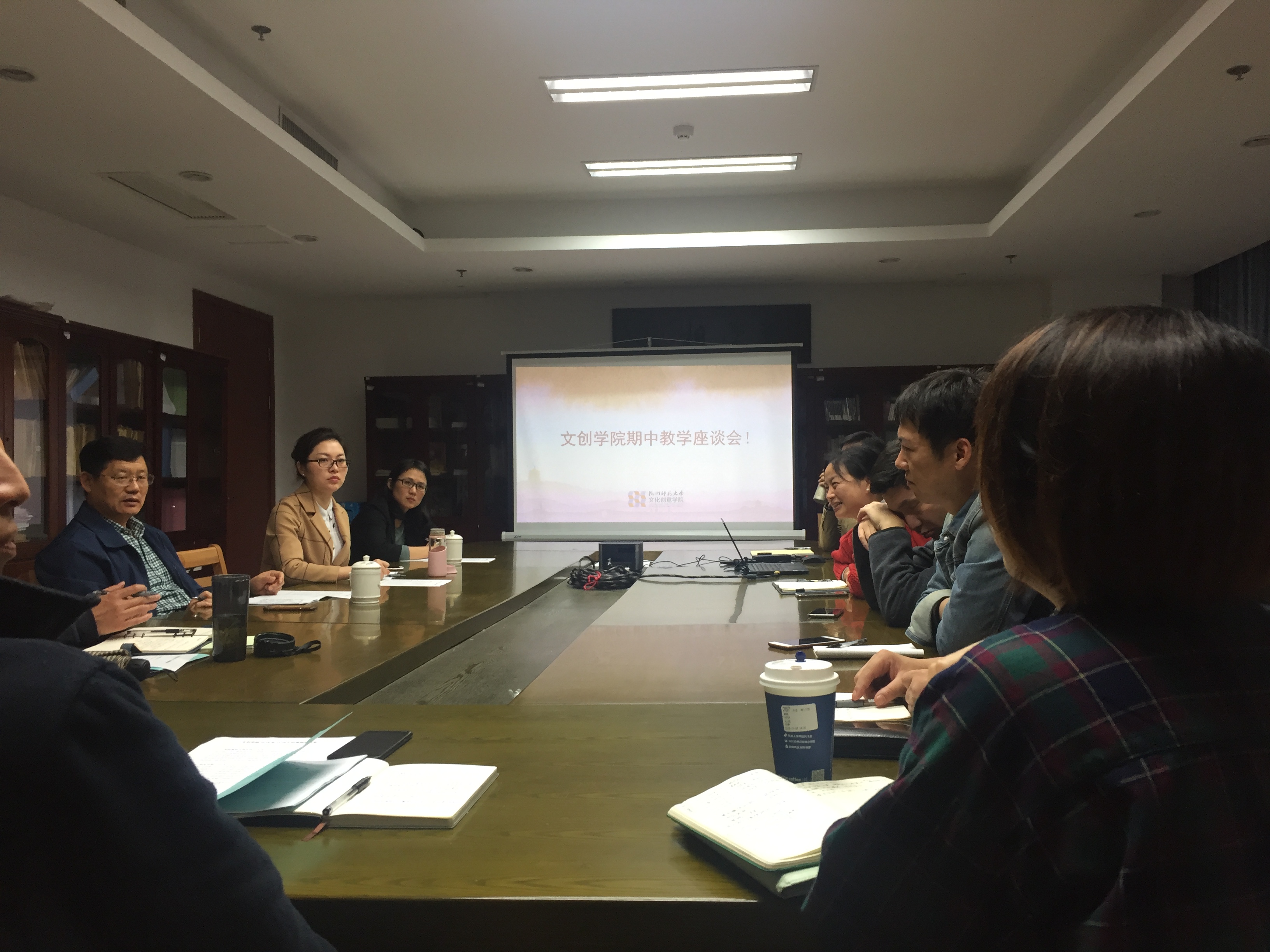 11月6日下午15:00 文创91制片 师生在恕园1-402召开期中教学座谈会,杨磊副校长和教务处的翁灵丽副处长等三人一行参加了此次会议。