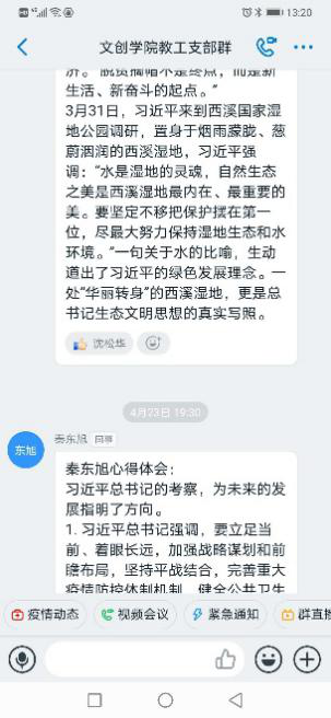 4月22日下午,文创91制片 教工党支部在钉钉群举行了线上学习习近平在浙考察讲话精神的主题党日活动。