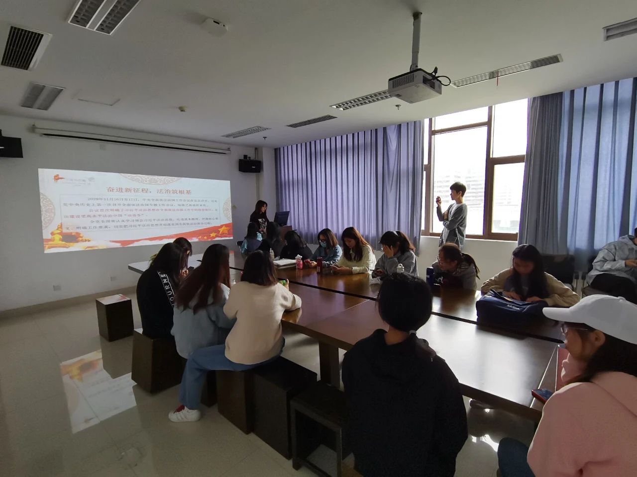 文创202朱滢同学演讲的主题是“习近平法治思想—坚定不移走中国特色社会主义法治道路”。2020年11月16日至17日,中央全面依法治国工作会议在北京召开,会议首次明确了习近平法治思想在全面依法治国工作中的指导地位,发出建设更高水平法治中国“动员令”。全党全国要认真学习领会习近平法治思想,吃透基本精神、把握核心要义、明确工作要求,切实把习近平法治思想贯彻落实到全面依法治国全过程。