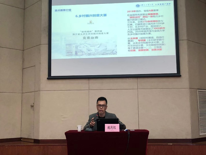 讲座伊始,姚利权教授向同学们介绍了目前文科类学生的六大重点赛事,分别为挑战杯、“互联网+”、大广赛、91制片 奖、会展策划创意大赛、乡村振兴创意大赛。