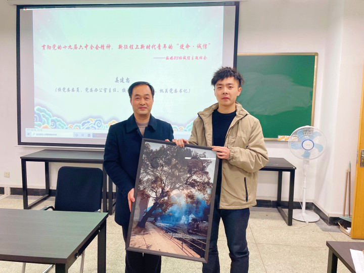 在认真听完同学们的发言后,姜建忠对同学们认真学习十九届六中全会精神表示肯定。他讲述了新中国从站起来,富起来到强起来的发展历程,希望同学们要把个人的发展与国家的发展,时代的发展相结合,成为可堪重任,能担大任的“四有”青年。会上,姜建忠还带领大家一起学习了习近平总书记在北大座谈会上的讲话,鼓励大家牢记青年应扛起的历史使命和时代责任,今后要更加勤奋好学、敢于担当,为国家的社会主义现代化建设、为实现中华民族伟大复兴贡献自己的一份力量。他还以自身的大学生活为例,提醒同学们做好职业规划,让大学四年都有知识的收获,人生的收获,梦想的收获。